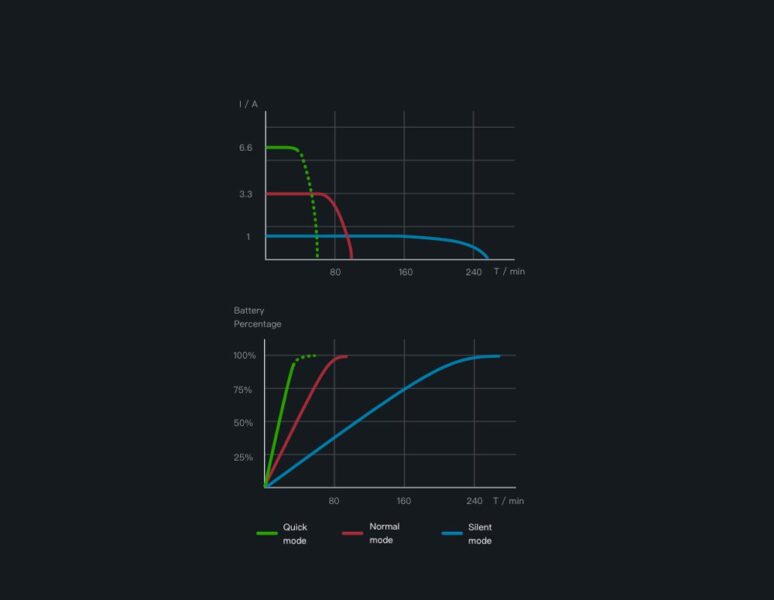 На съемочной площадке важна каждая секунда. Учитывая разные условия на съемочных площадках, мы разработали три режима зарядки – стандартный (Normal), быстрый (Quick) и тихий (Silent).Стандартный режим: станция полностью заряжает до восьми аккумуляторов ТВ50 Intelligent Battery одновременно.Быстрый режим: два аккумулятора ТВ50 Intelligent Battery с самым высоким уровнем зарядки заряжаются до 90% за 35 минут для срочного использования.Тихий режим: шум и скорость зарядки снижается (подходит для использования на съемочных площадках, требующих тишины, или для вечерней зарядки).